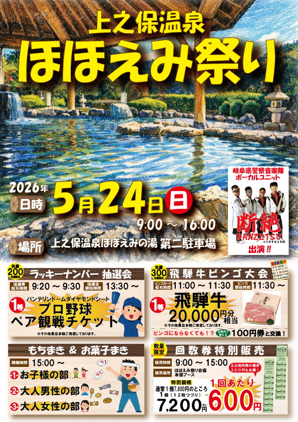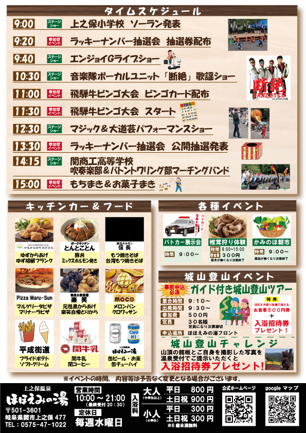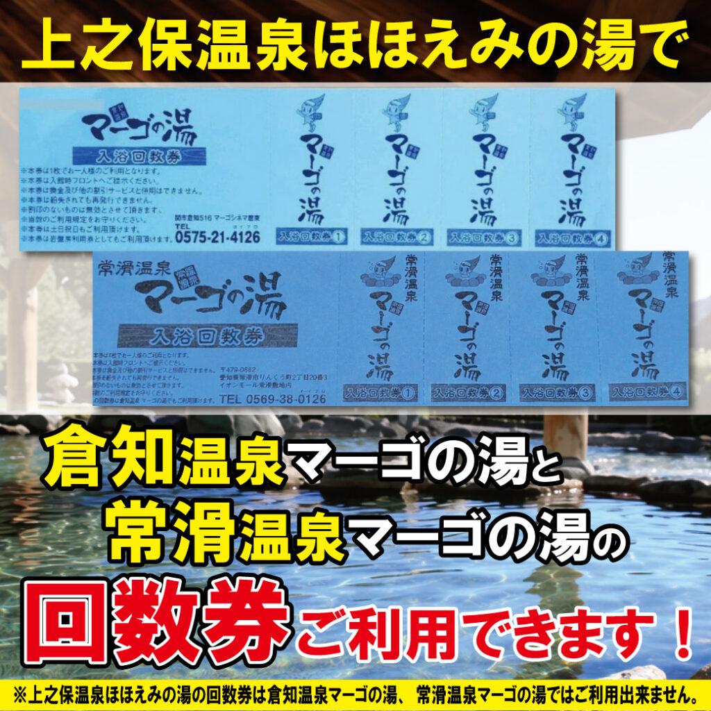 RVパークは1区画内1台の駐車でお願いいたします。 【上記の券のご利用に関して】 ※ご利用には別途入湯税50円かかります。 上之保温泉ほほえみの湯 With MAGO この度上之保温泉ほほえみの湯を管理させていただくことになりました大切な関市のお客様のため、更に努力してまいります